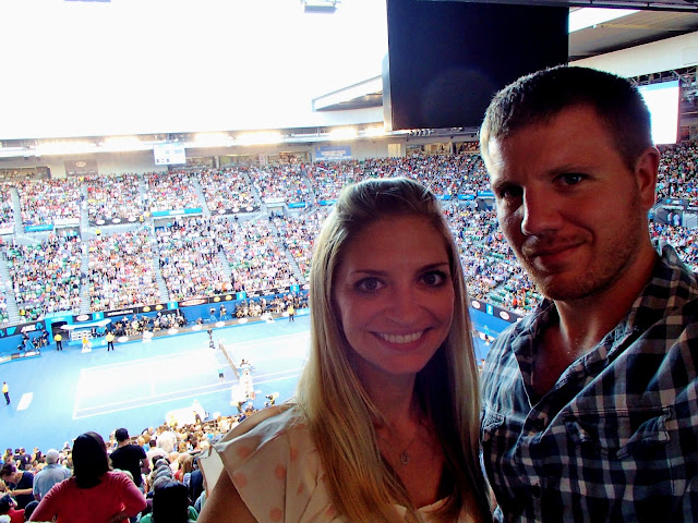 On January 14 the Australian Open began and we have been consumed with that every evening and weekend. Brian and I really get into it and watch a good portion of the matches. (I am not sure I would do this if there were any other options of shows on tv but Im glad there is nothing on so I can get into it!) Brian got to go with work and had AWESOME seats! Only a few rows back in the main stadium, the Rod Laver Arena. I even saw him on tv after the match was over! On Tuesday night Brian and I went to "the tennis". We started off the night listening to a little 80s cover band (with Slash on guitar!) and a sausage :) We went to the main arena and got to see a great match between the #1 (djokovic) and #5 (berdych) of mens singles. It was so amazing to get to see them play! Unfortunately, our seats weren't quite as good as when Brian went but the place is not too big so even the back seats are a great view! Djokovic won (as we suspected) and we really enjoyed watching the number 1 tennis player do his thing! So great!